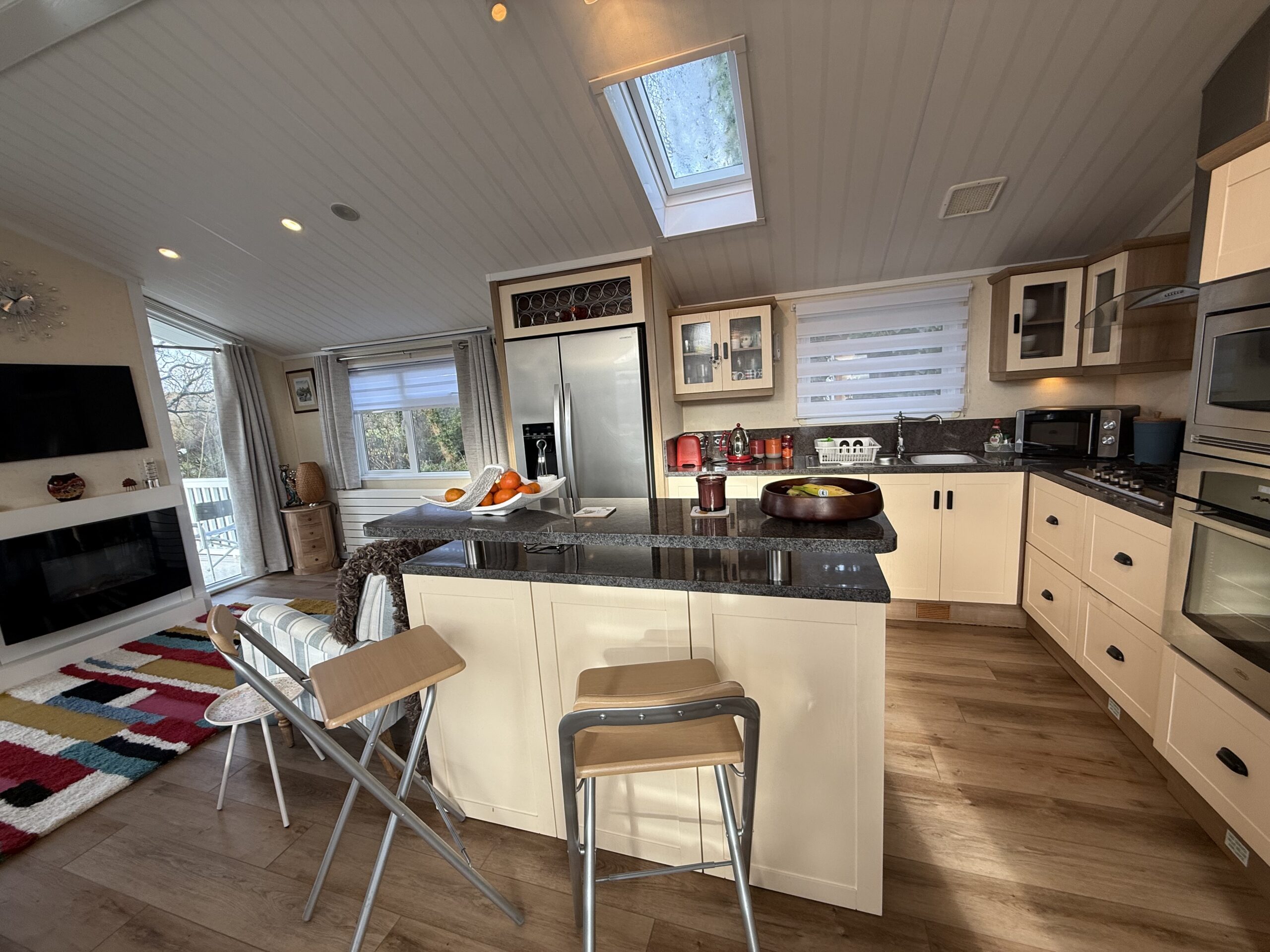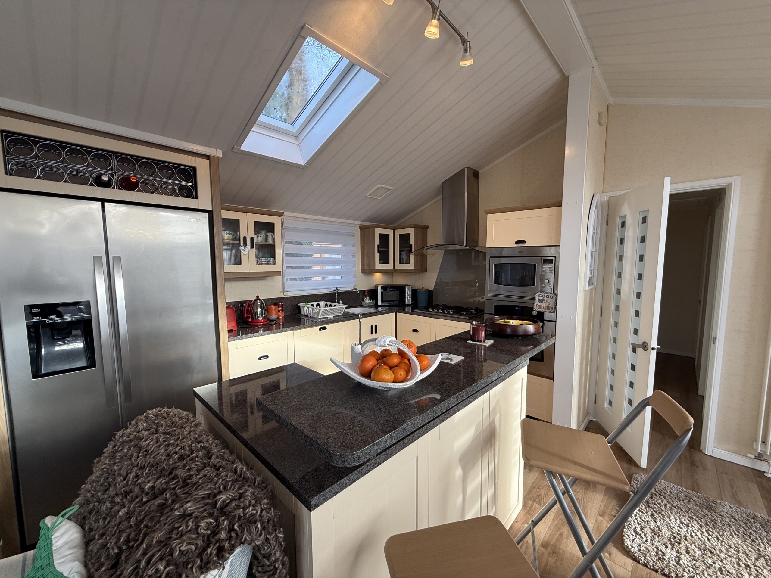 The kitchen is fully equipped with a large American fridge/freezer, complete with an ice maker, making it perfect for storing everything you need for your stay. With its blend of modern luxury and natural beauty, the Laburnum 2-Bed Lodge is the perfect place for a peaceful getaway, where both comfort and breathtaking views come together.